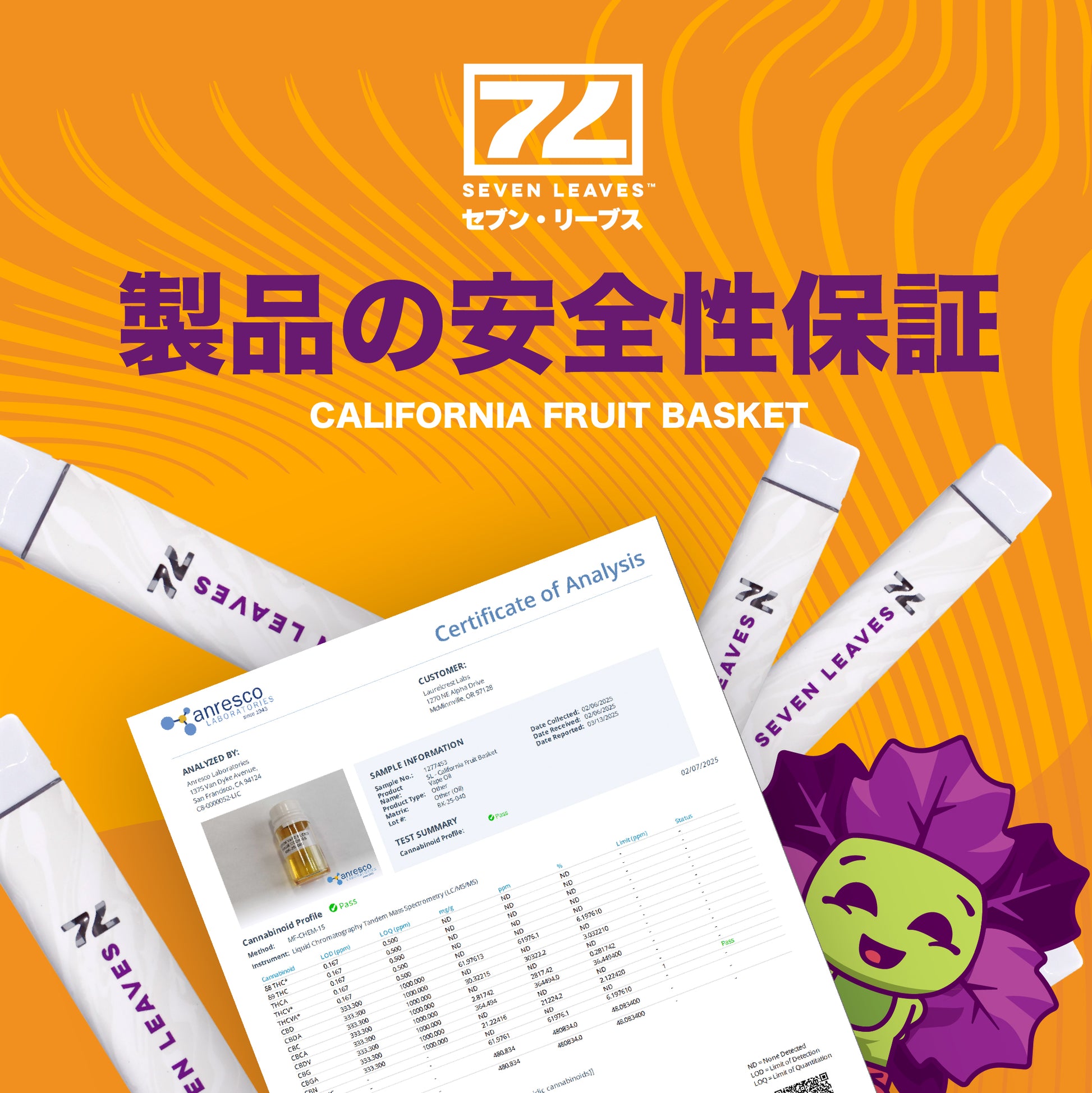 テルペン:100%ヘンプ由来ライブレジンテルペン(フラボノイドやその他ヘンプ由来成分入り)成分分析書(CoA):第三者機関の試験済みで品質・安全性を保証。画像7参照
